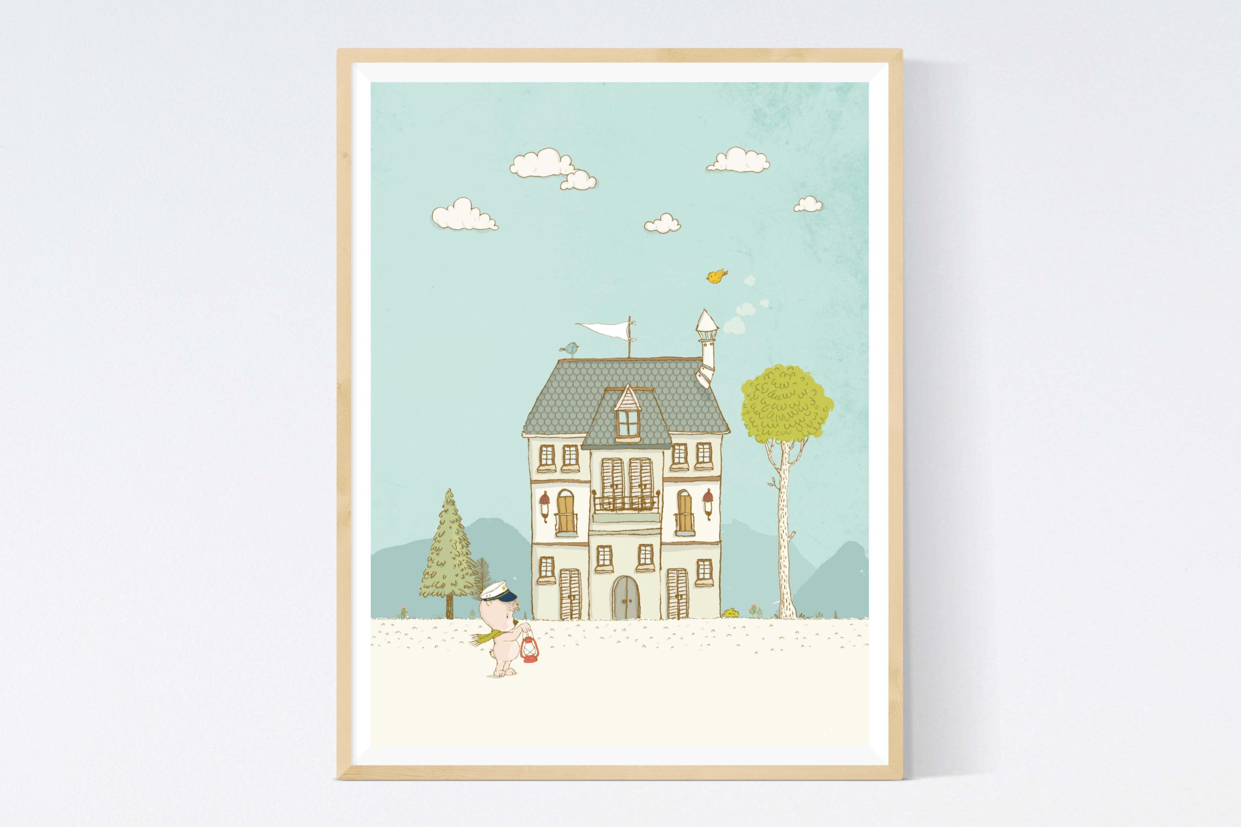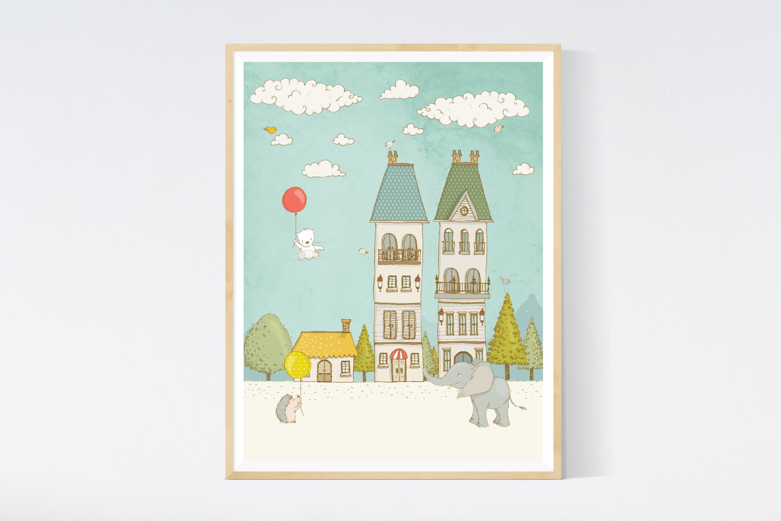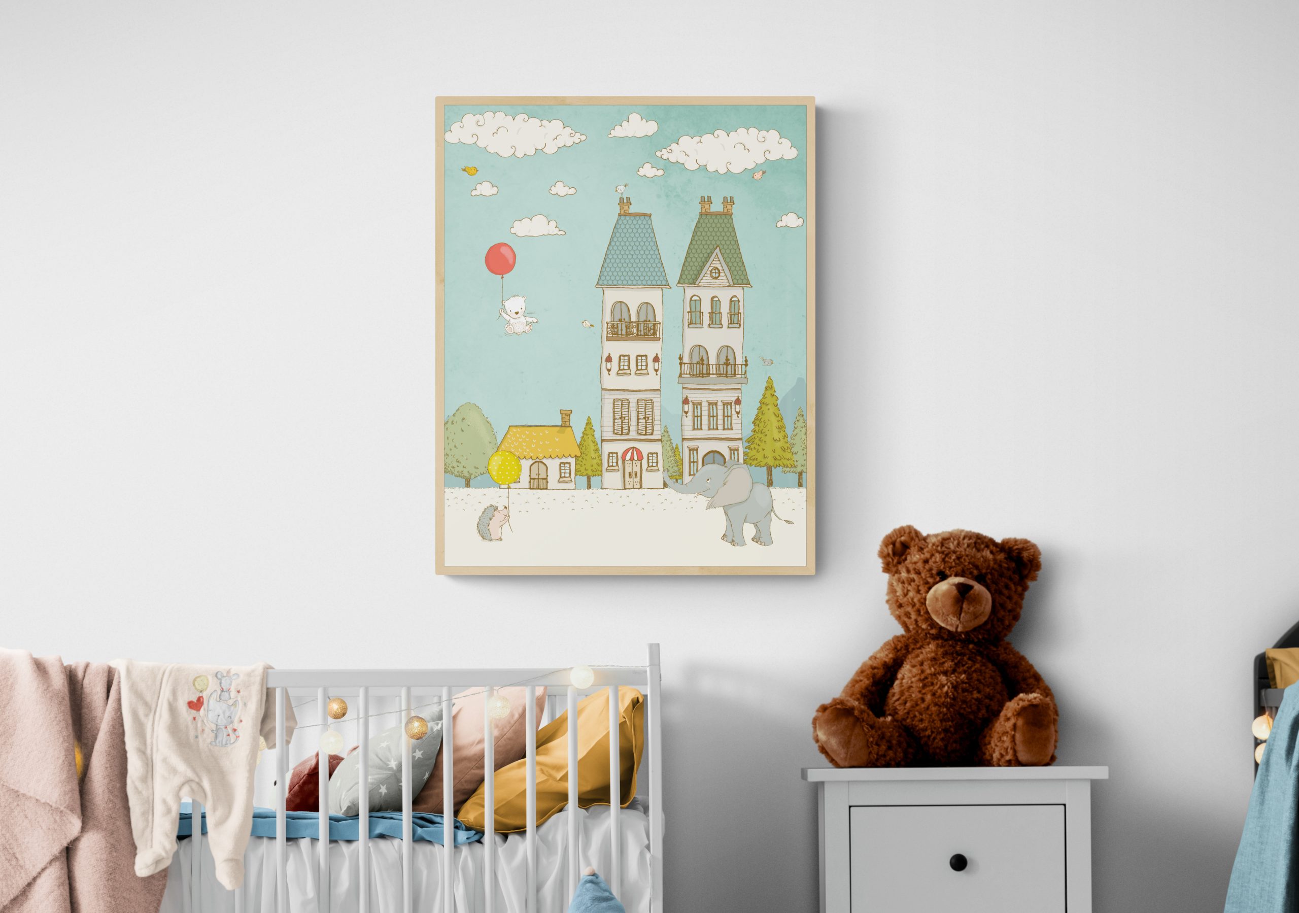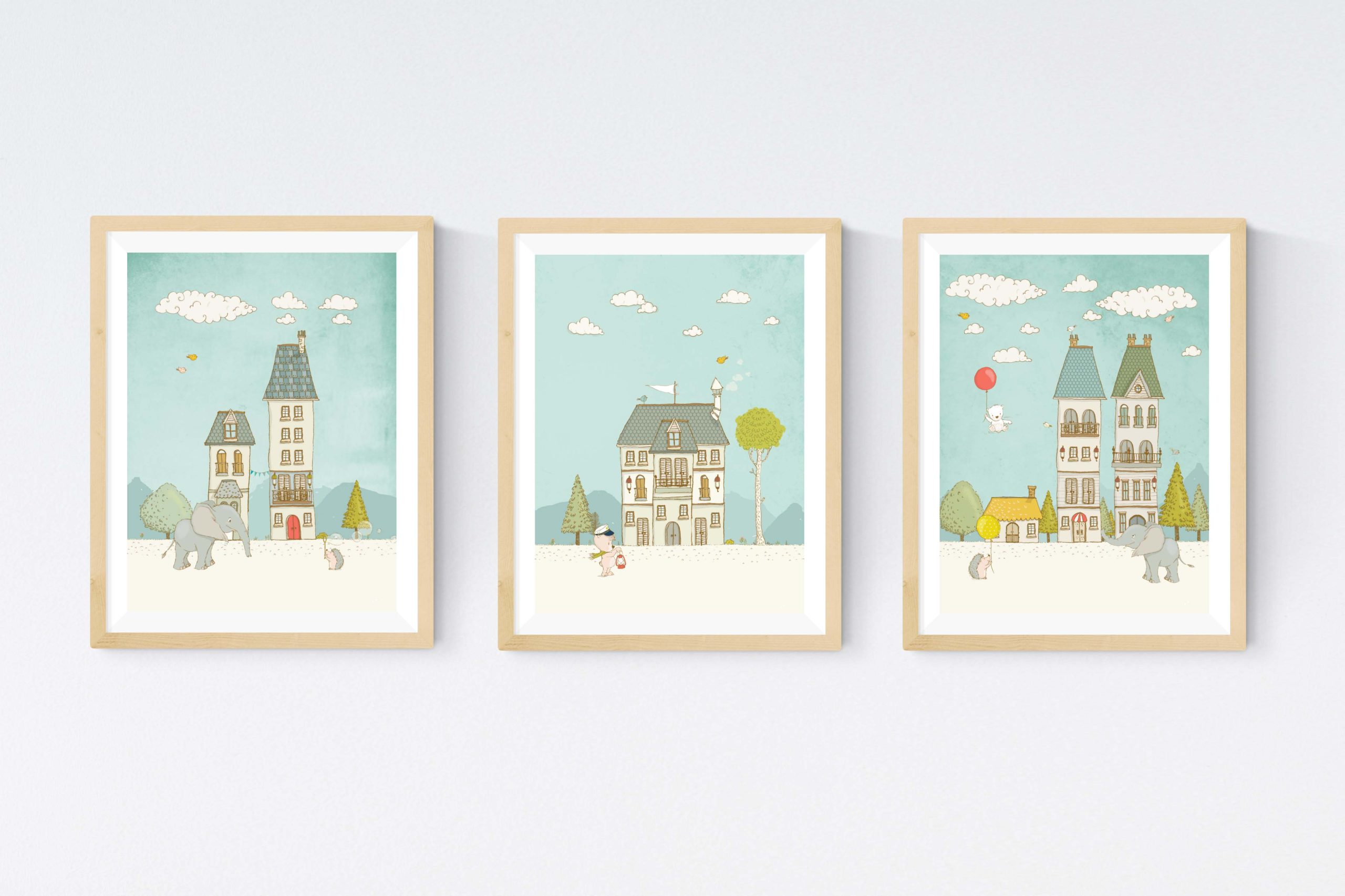 This set of three printable nursery art files is featuring the friendship of a bear, an elephant and a hedgehog and their village adventures.