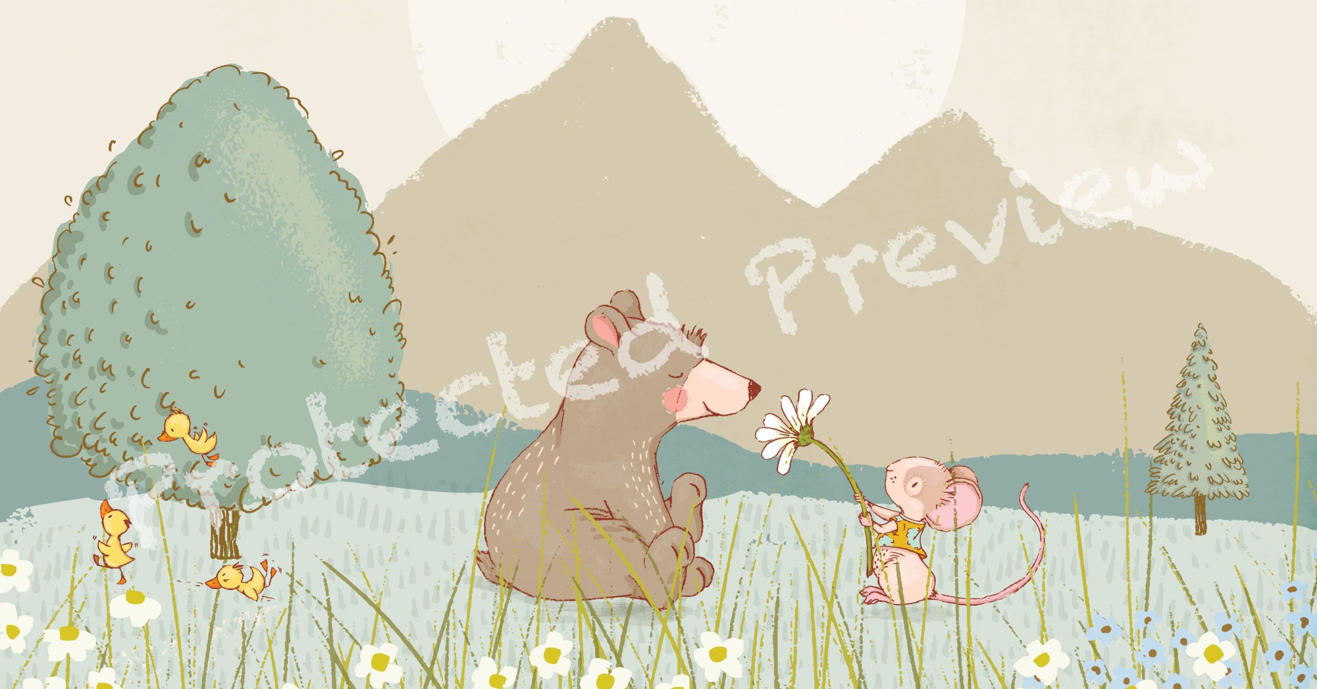 This cute printable nursery illustration is featuring a bear and mouse sitting in the meadows.