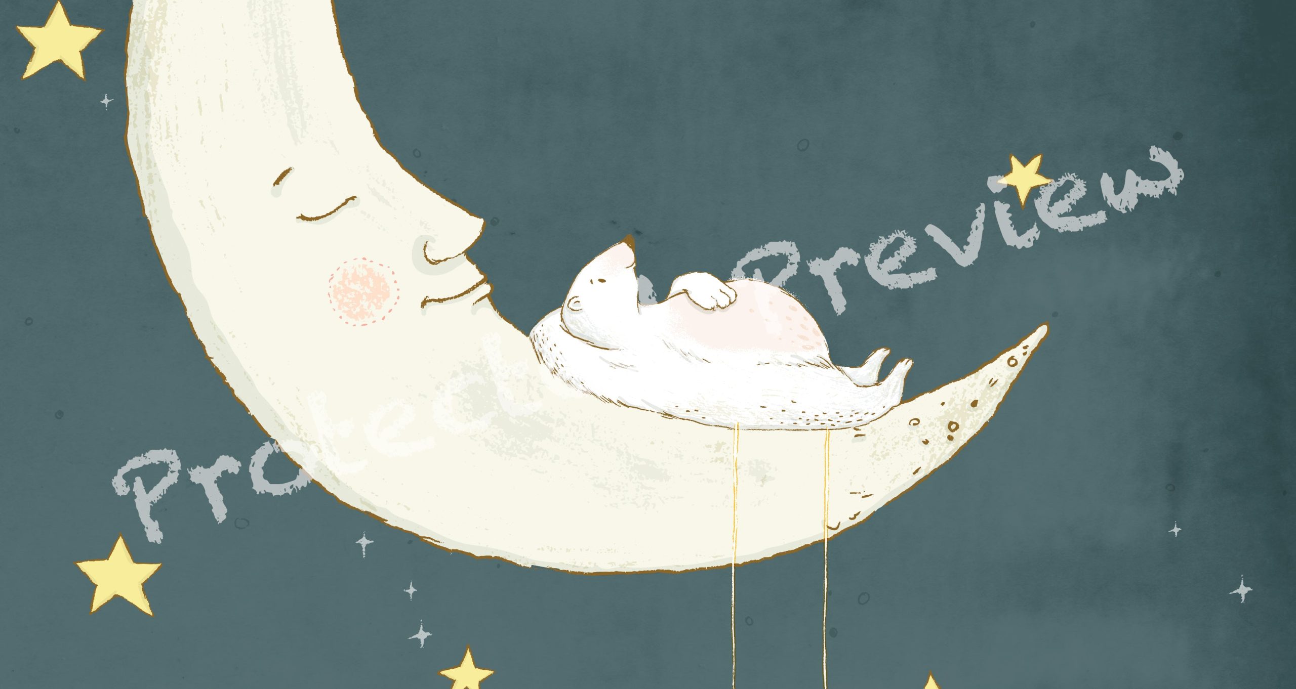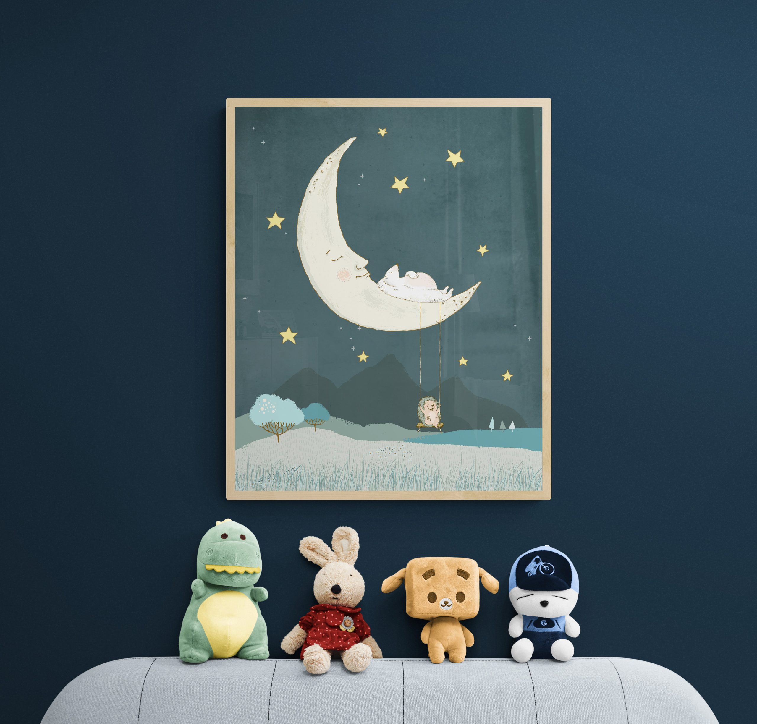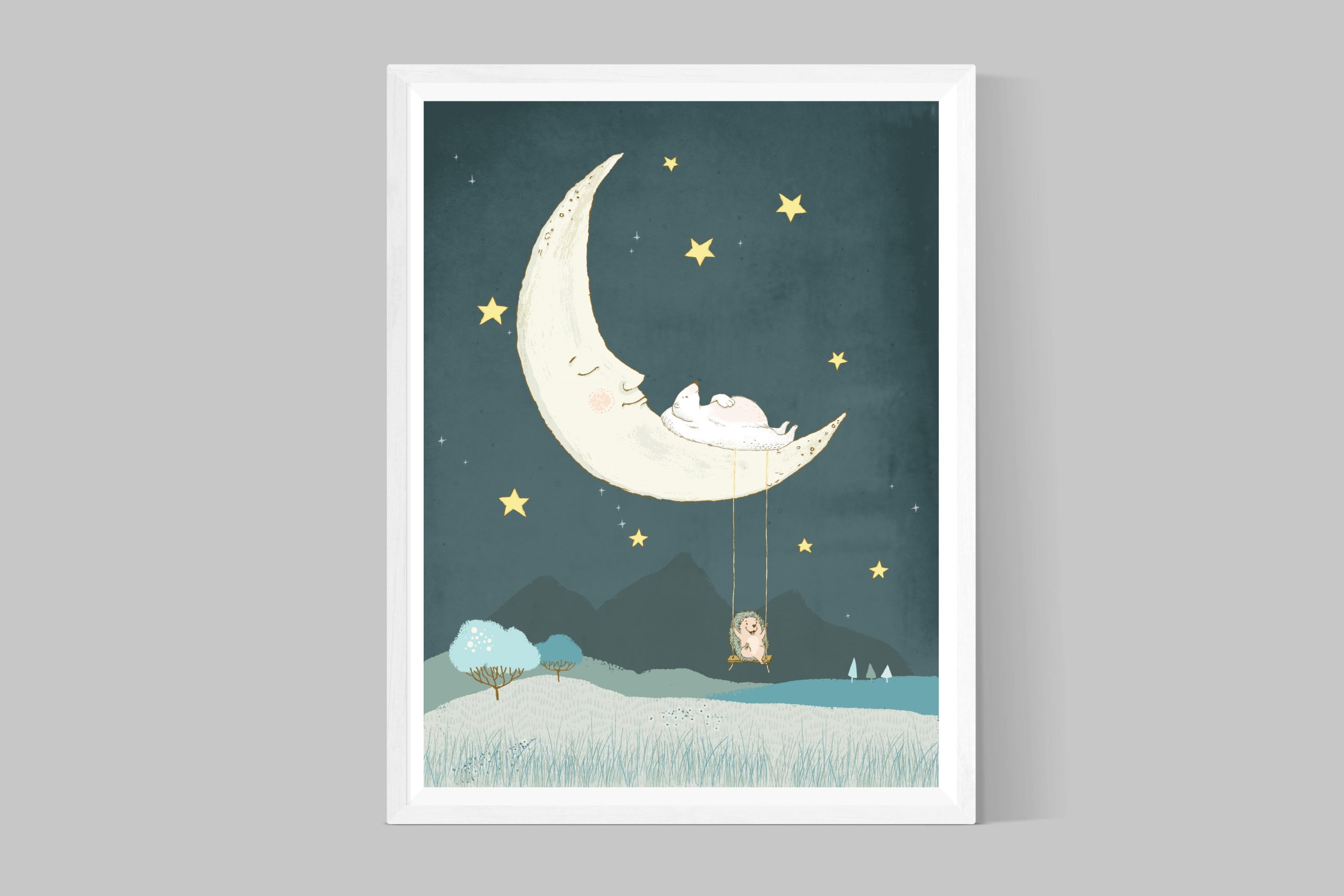 This dreamy, happy and whimsical nursery illustration is featuring a bear sleeping on the moon and a swinging hedgehog. Dream On my friends.