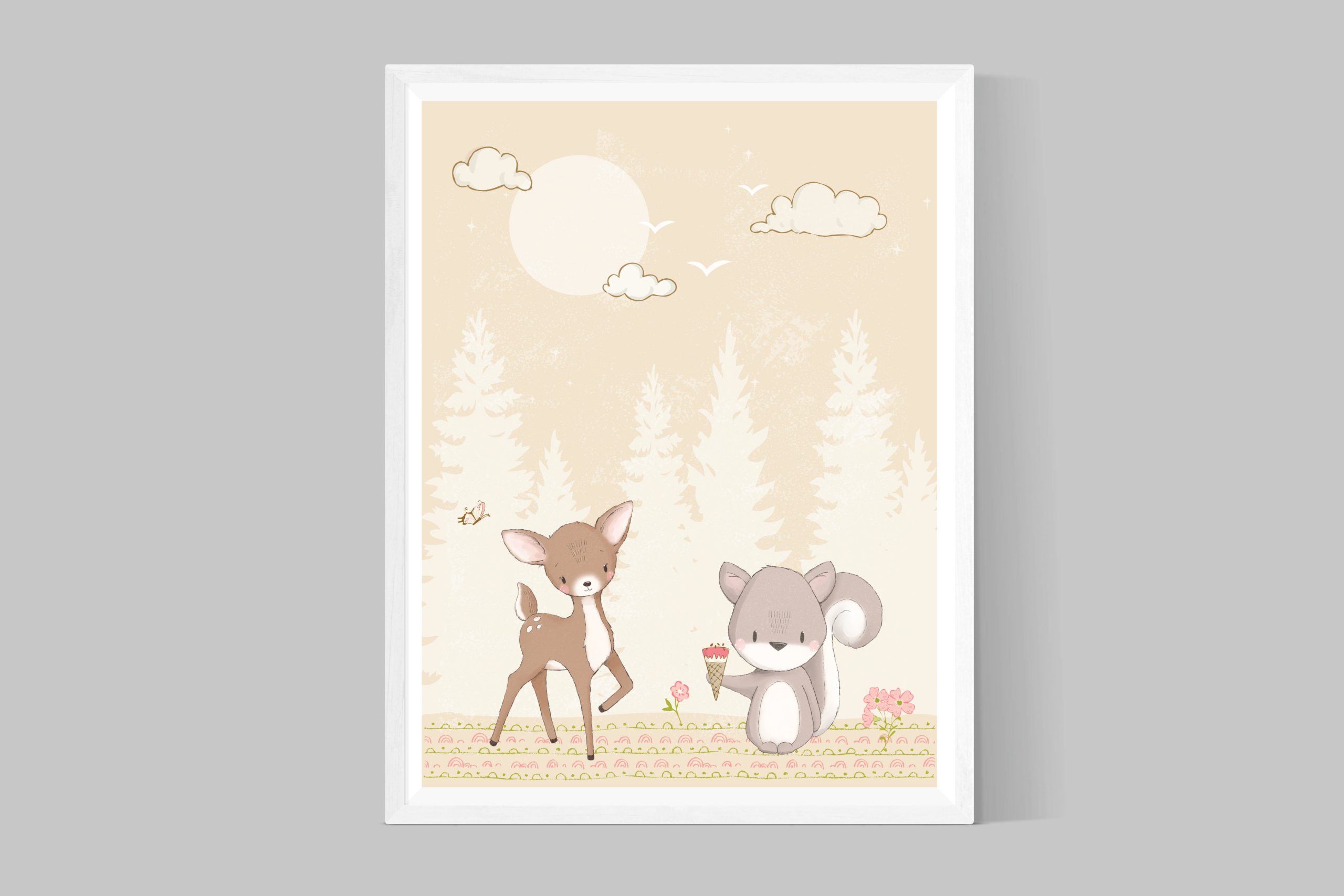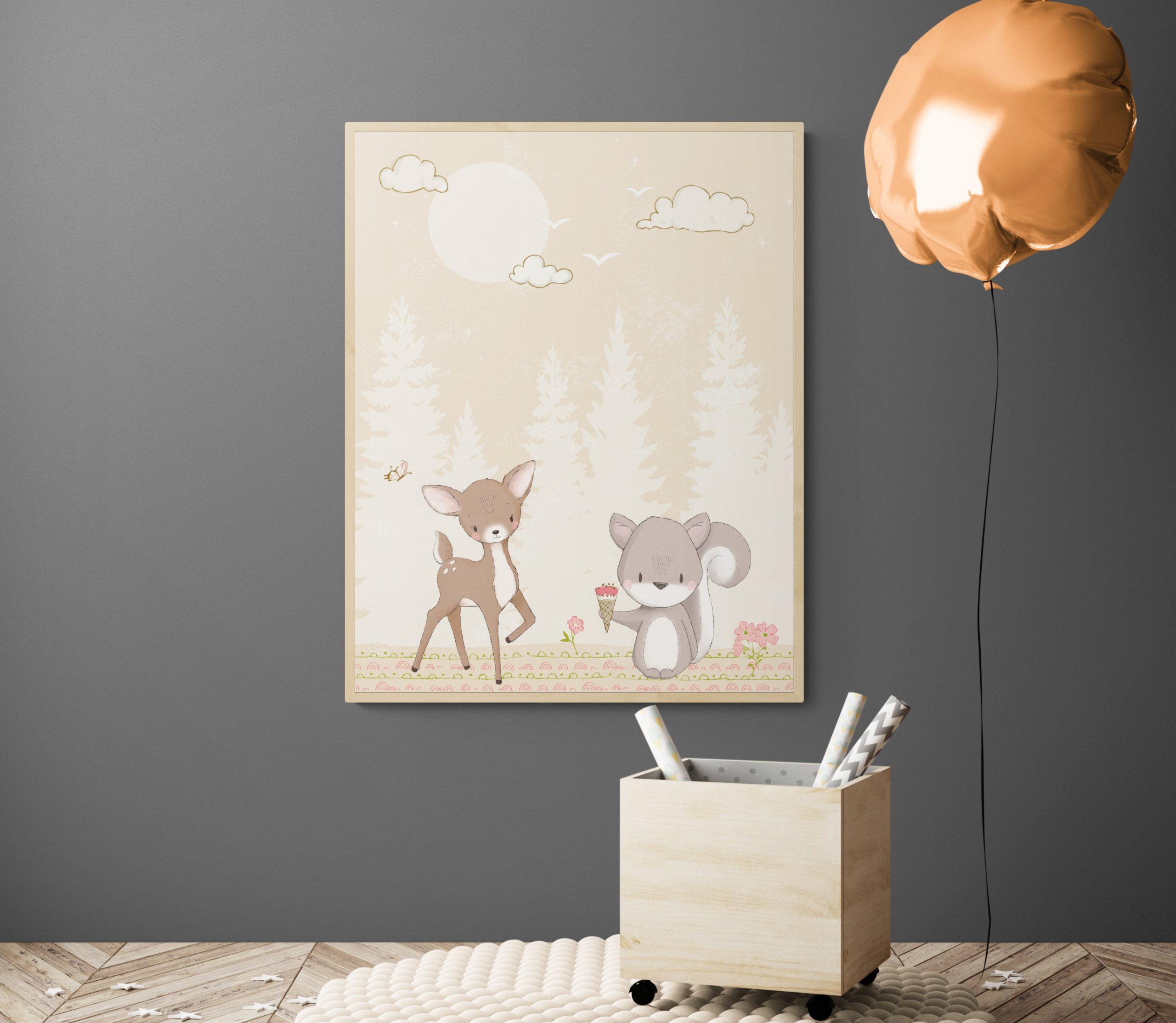 This printable woodland nursery animal illustration is featuring a deer and a squirrel to add some details your modern woodland nursery or young kids room.