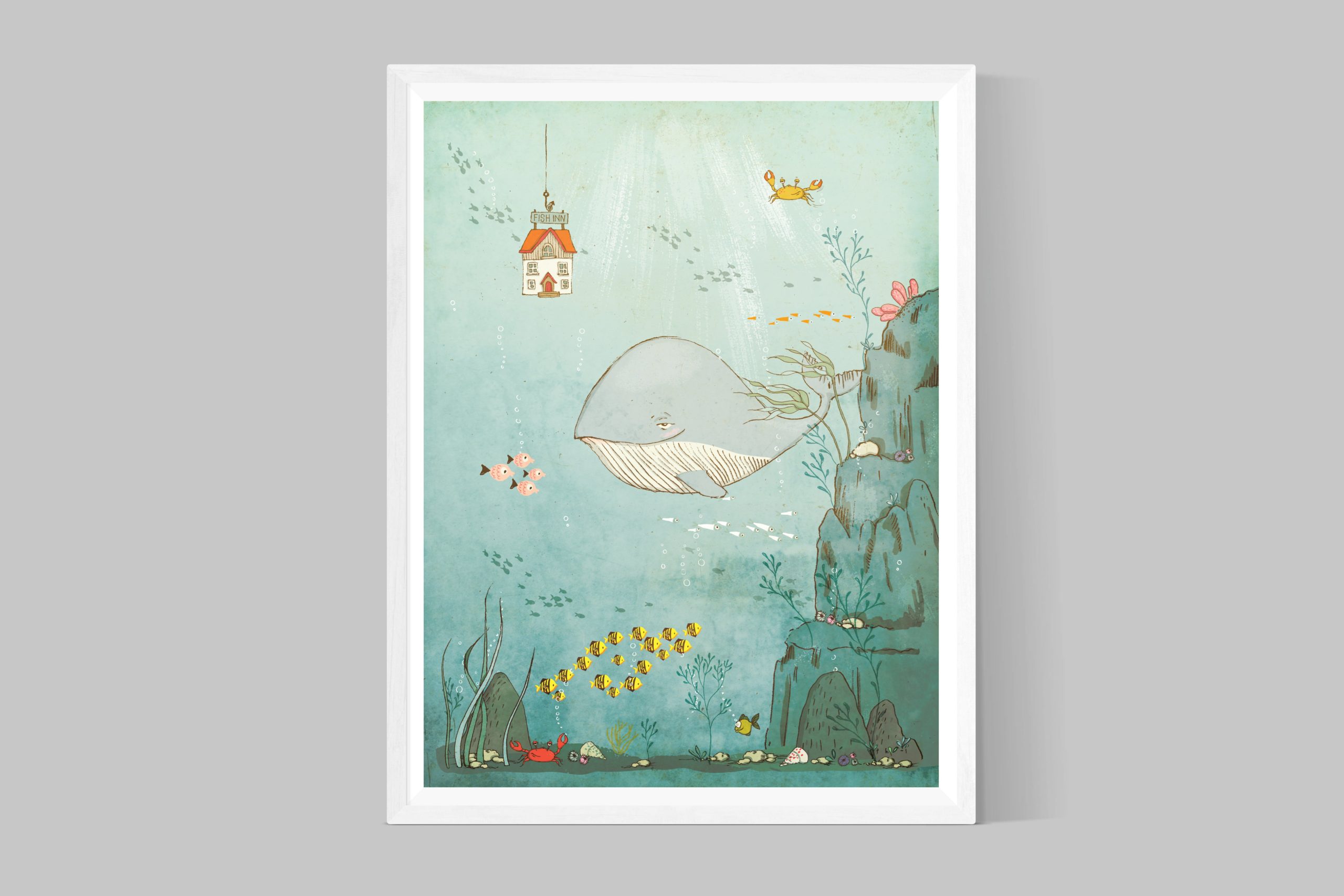 This cute printable nursery illustration is featuring a whale in its natural underwater world. The ocean as cute and whimsical as it can be.