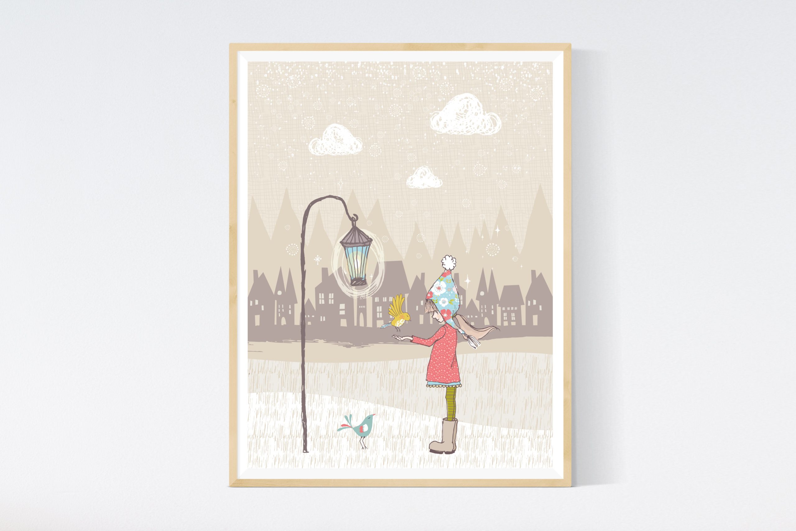 This detailed and modern nursery illustration is featuring a girl feeding the colorful birds in snowy winter scene.