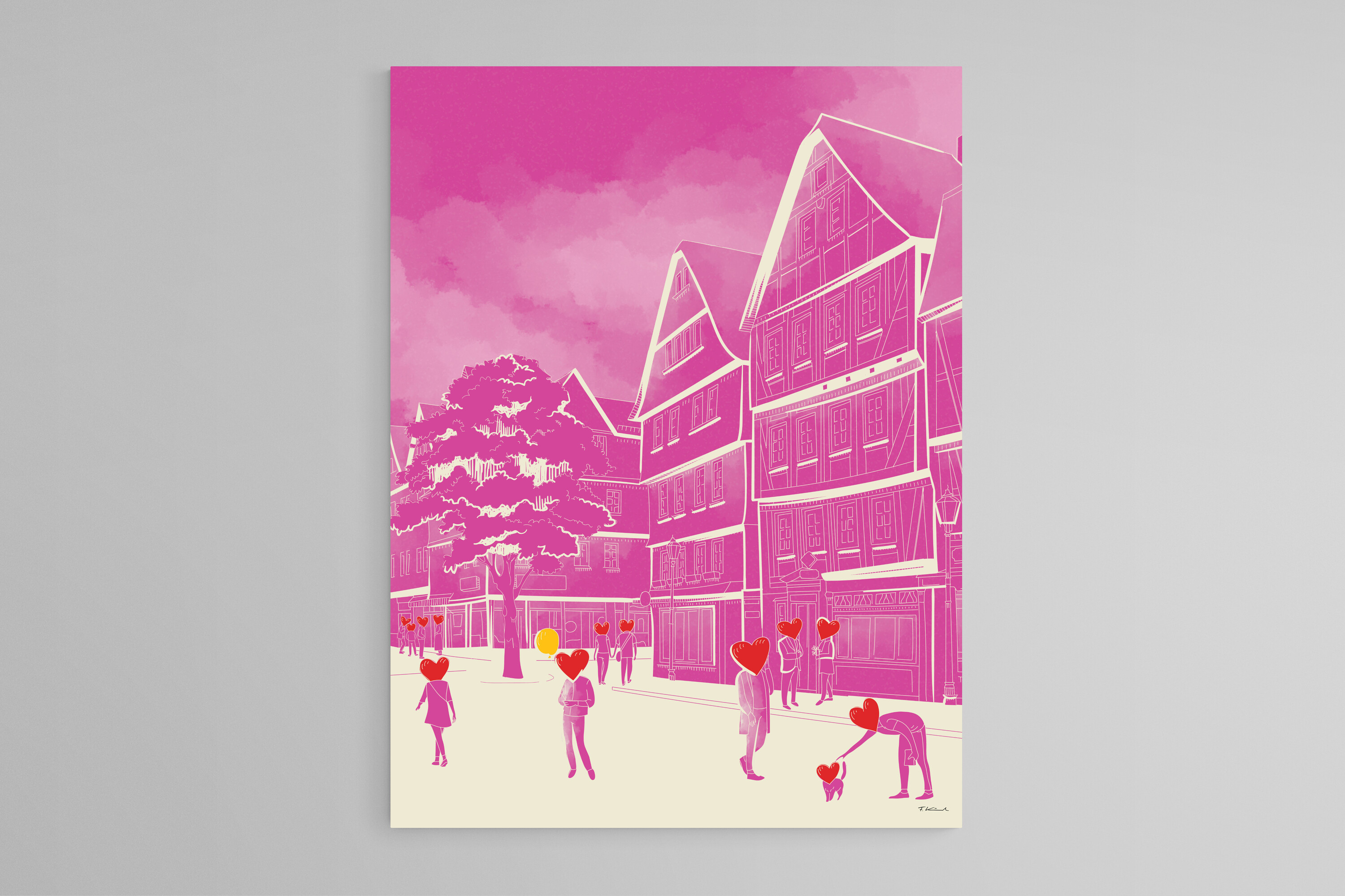 Der Holzmarkt als monochrome Illustration – reduziert auf die charakteristische Architektur und klare Linien.